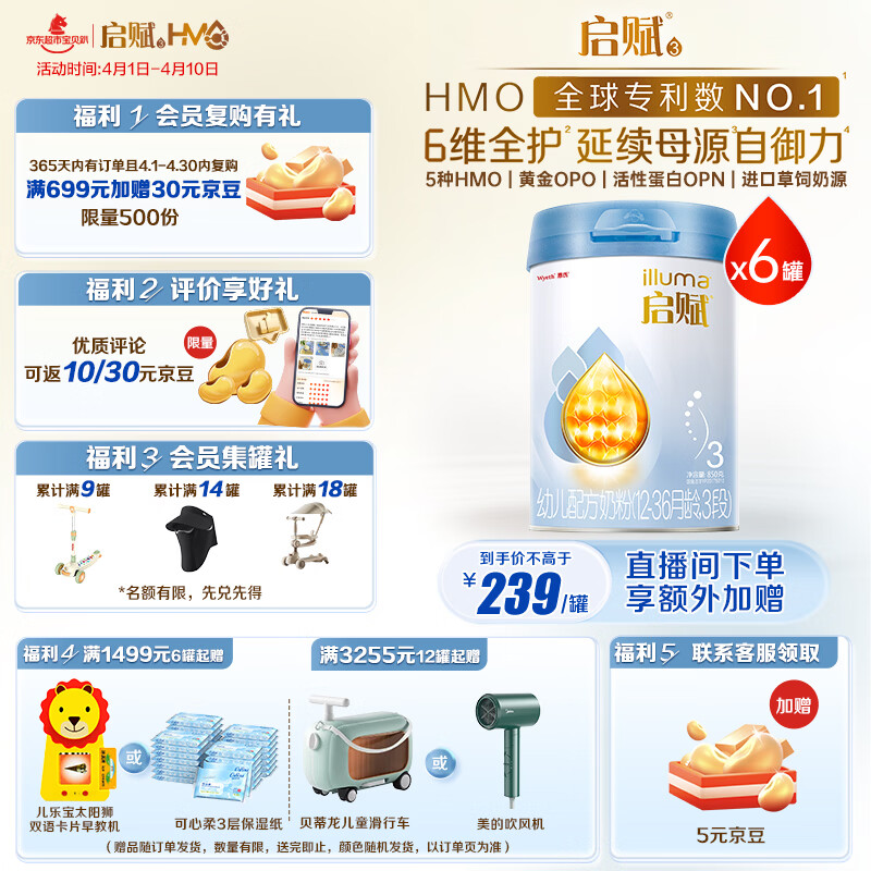 惠氏(Wyeth)启赋蓝钻【加量装】HMO幼儿配方奶粉3段(12-36月)850g*6罐 OPO