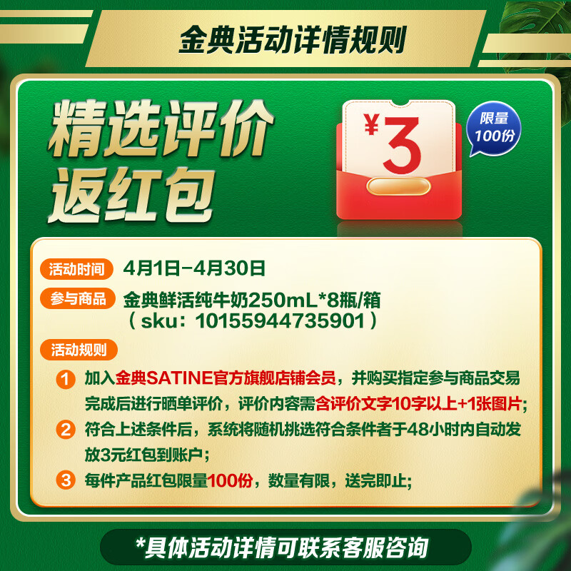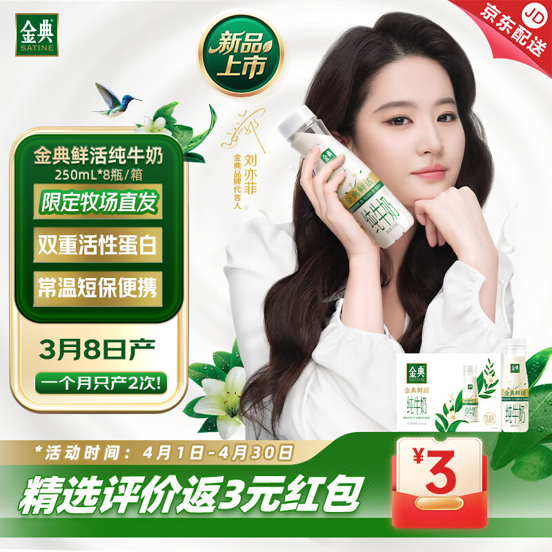 金典鲜活纯牛奶整箱 3.8g乳蛋白 礼盒装 双重活性营养-3月产 金典鲜活纯牛奶250ml*8瓶*1箱
