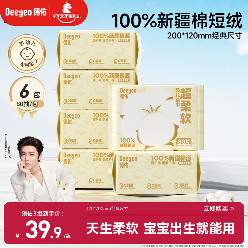 德佑超柔软100%新疆棉源柔巾婴儿洗脸巾干湿两用新生儿专用80抽6包