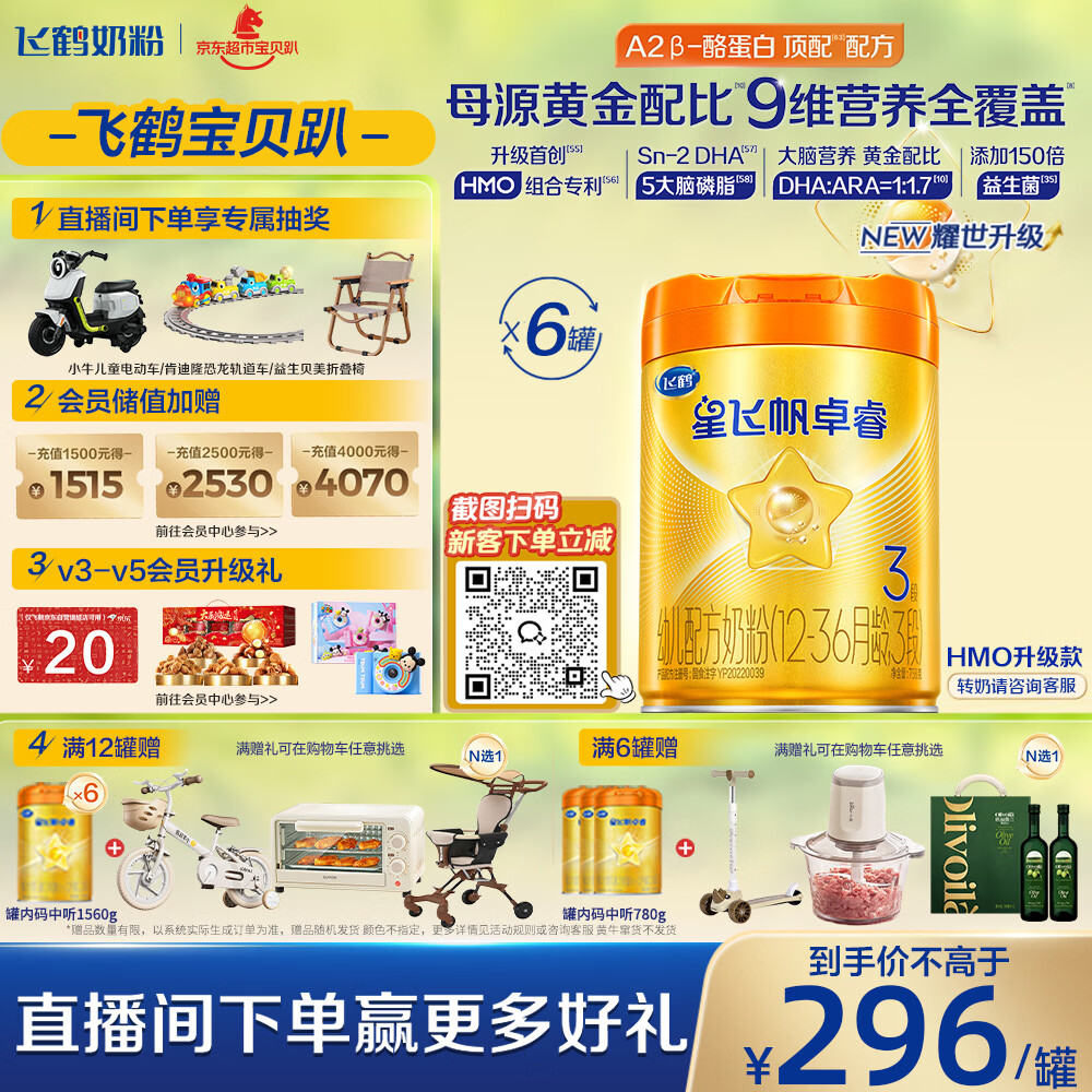 飞鹤星飞帆卓睿Pro A2 β-酪蛋白3段(1-3岁)幼儿配方奶粉758g*6罐