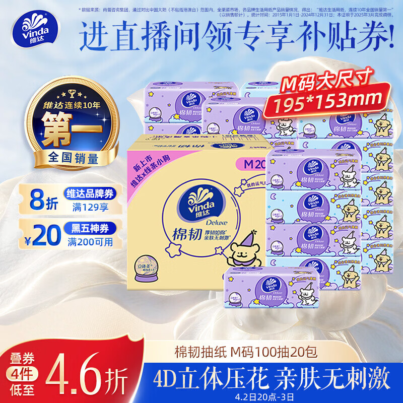 维达(Vinda)抽纸 棉韧3层100抽*20包M码 线条小狗联名 纸巾卫生纸 整箱