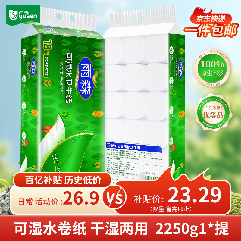 雨森(YUSEN)无芯卷纸可湿水5层125g*18大卷家用卫生纸巾厕纸手纸源头直发包邮
