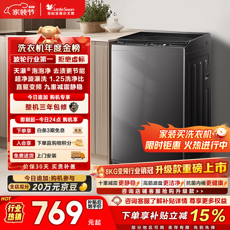 小天鹅(LittleSwan)波轮洗衣机小型全自动家用 8KG 直驱变频 TB80V26DT 以旧换新 国家补贴 京东自营 一级能效
