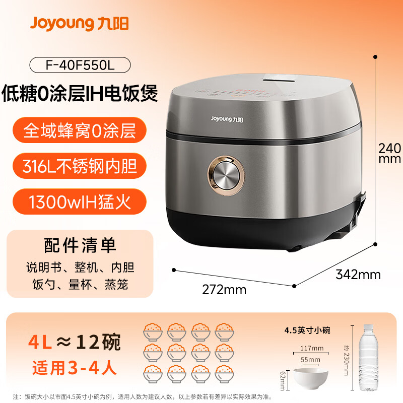 九阳(Joyoung)【全域蜂窝0涂层】低糖1300W电饭煲电饭锅4升3-4人无涂层5A认证316L内胆IH加热40F550L国家补贴