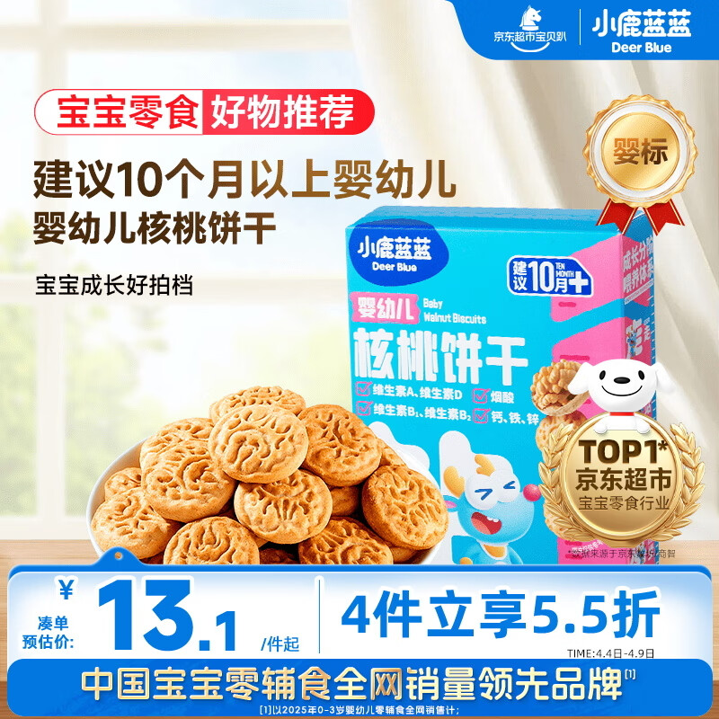 小鹿蓝蓝婴幼儿核桃饼干宝儿童零食无添加食盐饼干强化钙铁锌营养65g