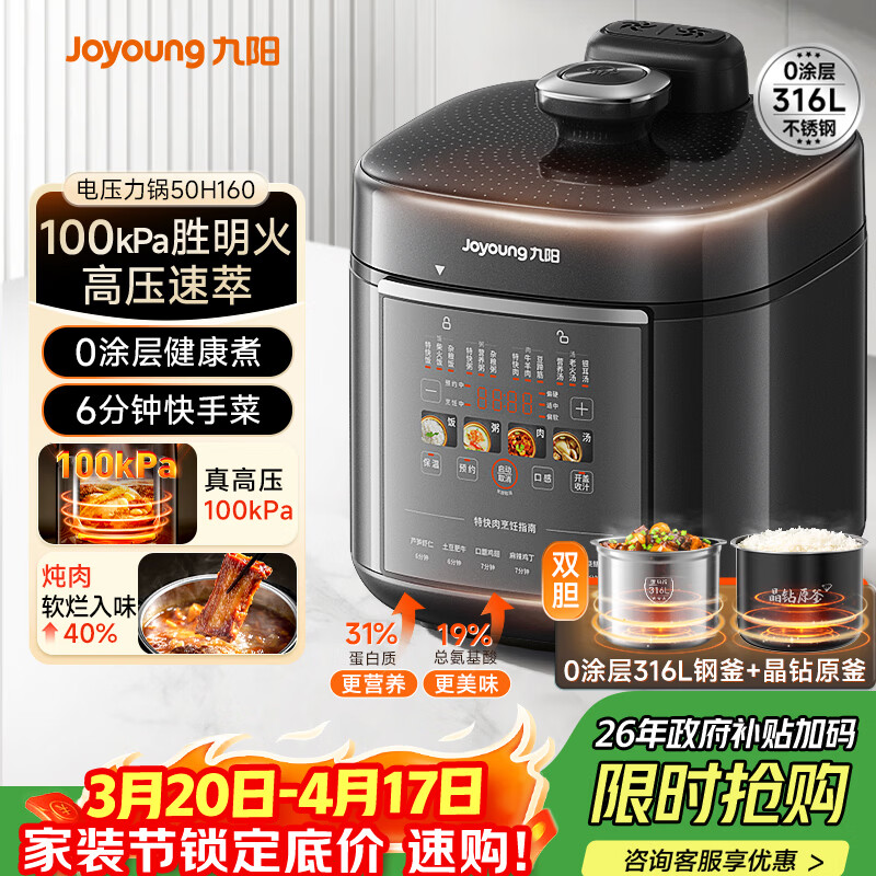九阳(Joyoung)100kPa速萃电压力锅0涂层316L不锈钢内胆5L双胆智能预约家用电饭煲50H160高压锅4-6人