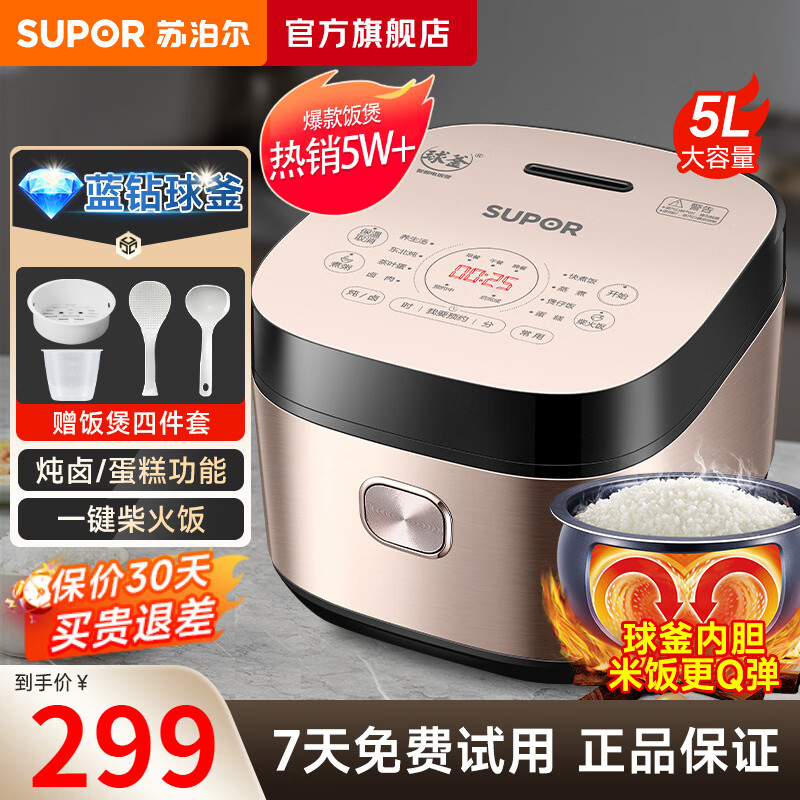 苏泊尔(SUPOR)电饭煲家用4-5-8个人电饭锅柴火饭球釜大容量 不粘内胆多功能蓝钻球釜炖卤预约功能 【蓝钻球釜】 5L 金色