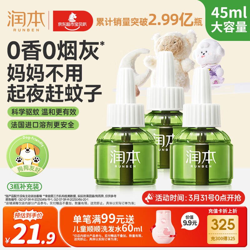 润本蚊香液电蚊香液驱蚊液45ml*3瓶驱蚊防蚊补充装(无蚊香加热器)