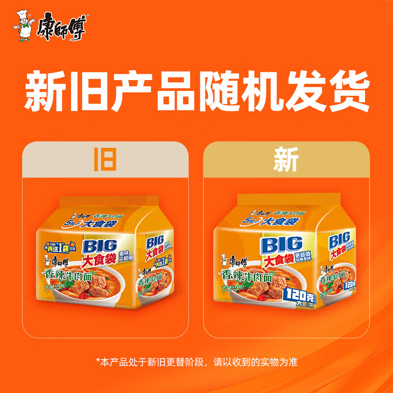 康师傅 方便面 大食袋香辣牛肉面五连包144g*5 泡面袋装速食 方便食品
