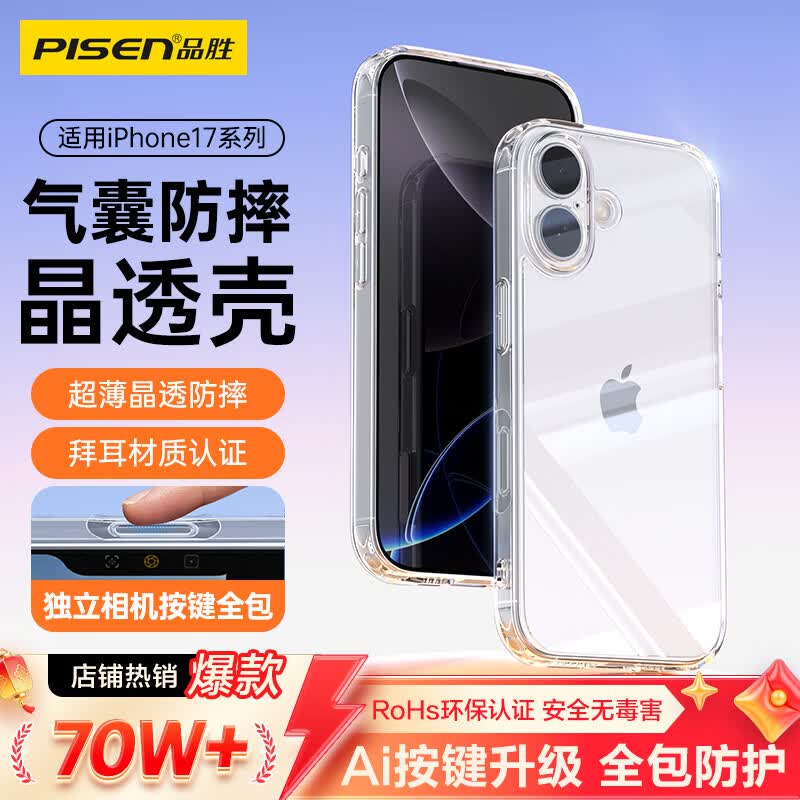 品胜【相机键全包轻薄散热】适用iPhone17手机壳苹果17保护套透明气囊防摔软边抗指纹保护壳