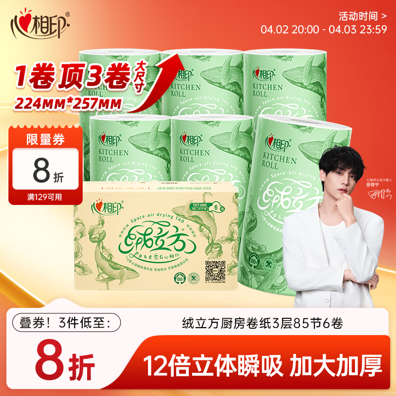 心相印绒立方厨房卷纸85节*6粒 12倍吸油锁水可接触食物 厨房专用纸巾