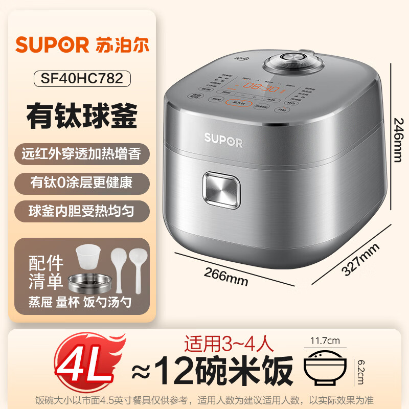 苏泊尔(SUPOR)电饭煲有钛0涂层IH加热球釜家用4升4-5人不锈钢不粘锅多功能智能电饭锅【爱心饭煲】40HC782
