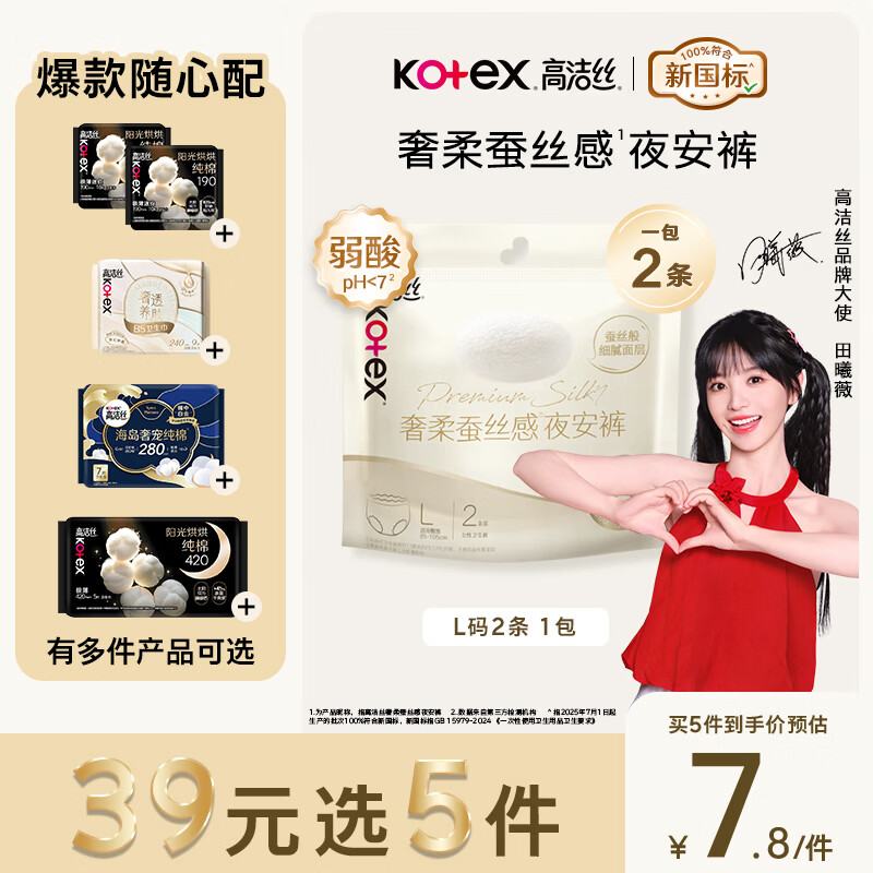 高洁丝【39元任选5件】顶配柔软蚕丝感夜安裤L号2条裤型卫生巾