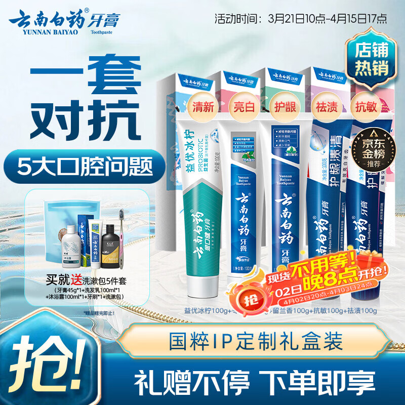 云南白药牙膏亮白护龈清新口气祛渍5效护口成人牙膏国粹礼盒套装5支500g