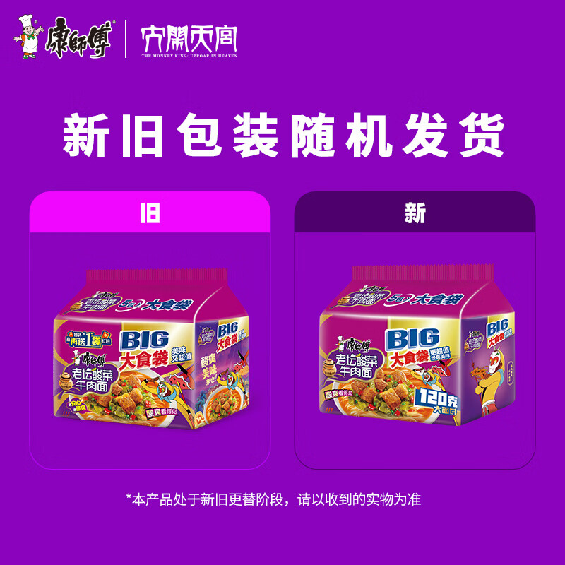 康师傅 方便面 大食袋酸菜牛肉面五连包162g*5 泡面袋装速食 方便食品