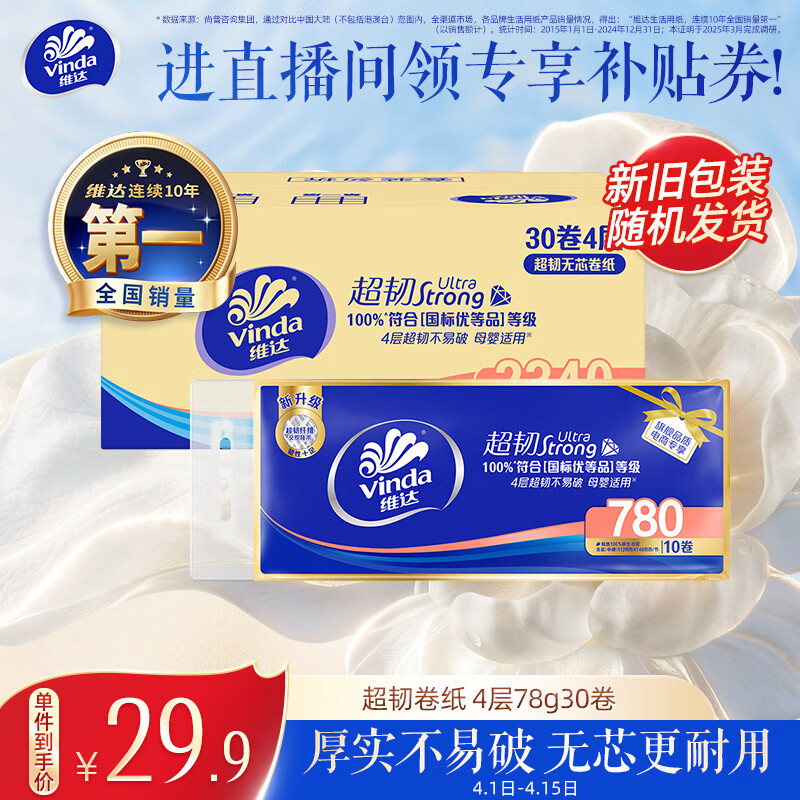 维达(Vinda)无芯卷纸 超韧4层78克*30卷 加厚升级 卫生纸厕纸卷筒纸纸巾整箱