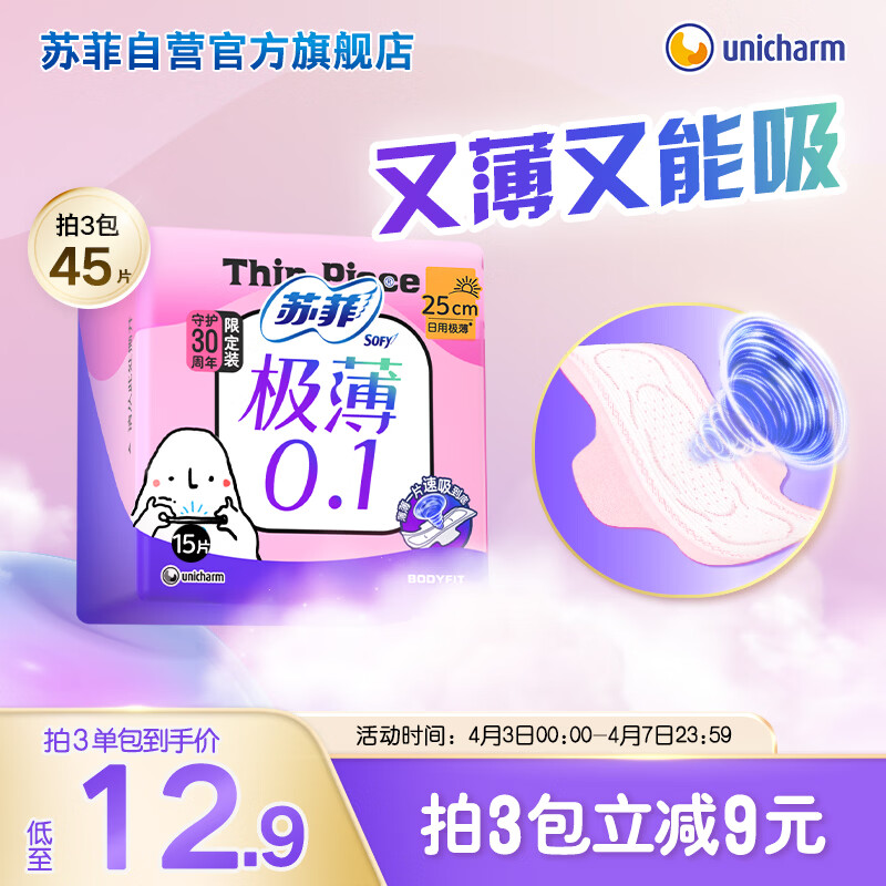 苏菲极薄0.1无感日用卫生巾250mm15片透气无感姨妈巾京东自营官方旗舰