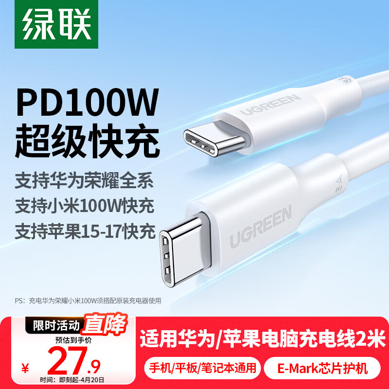 绿联适用华为苹果笔记本电脑充电线Type-C数据线双头PD100W超级快充ctoc小米荣耀苹果17/16e/15线2米