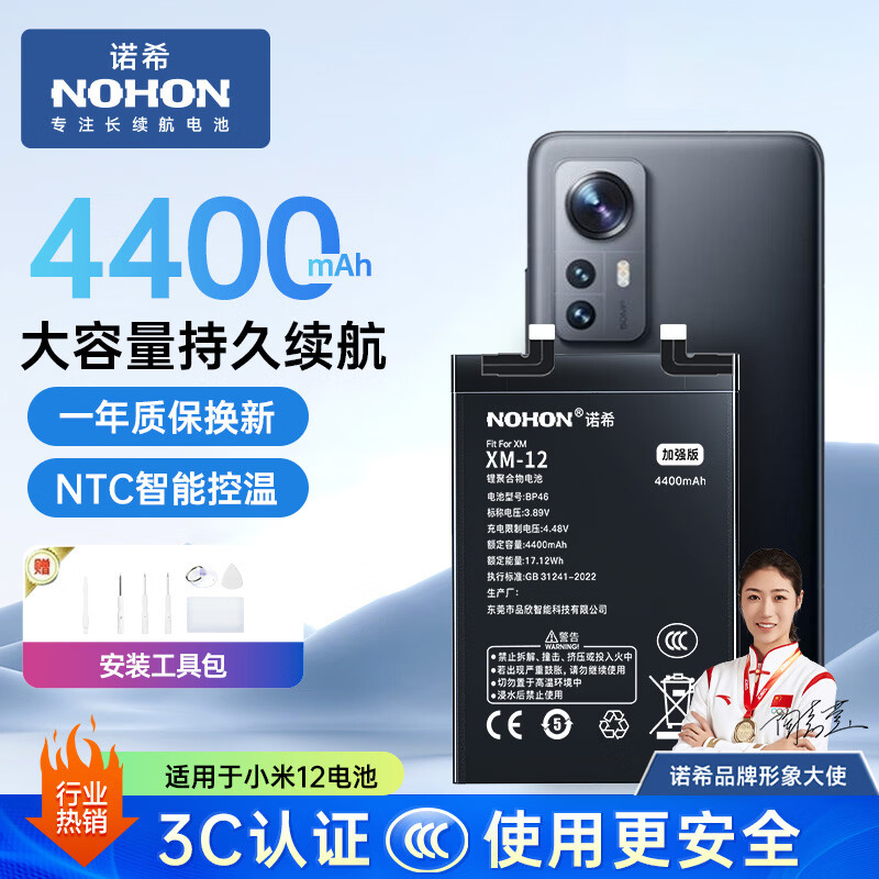 诺希 适用于小米12手机电池 内置电池更换超大容量4400mAh 通用小米12/小米12X/12S-BP46