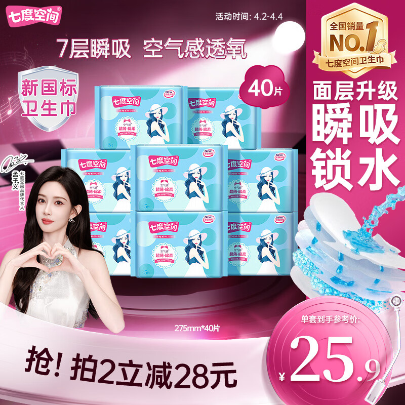七度空间优雅卫生巾棉柔超薄透气加长日用亲肤275mm40片【新国标认证】