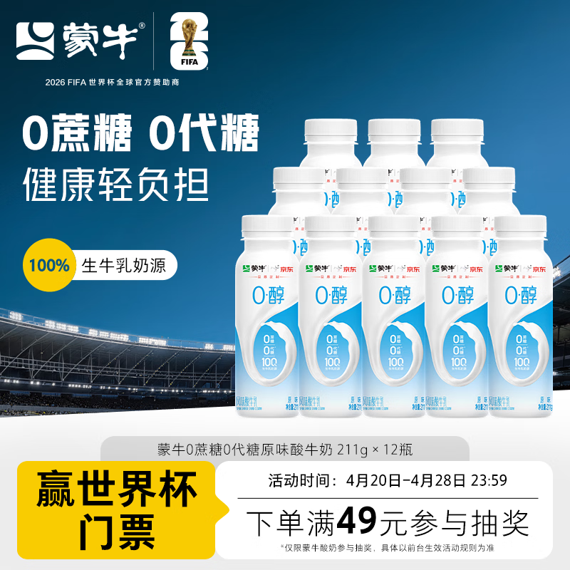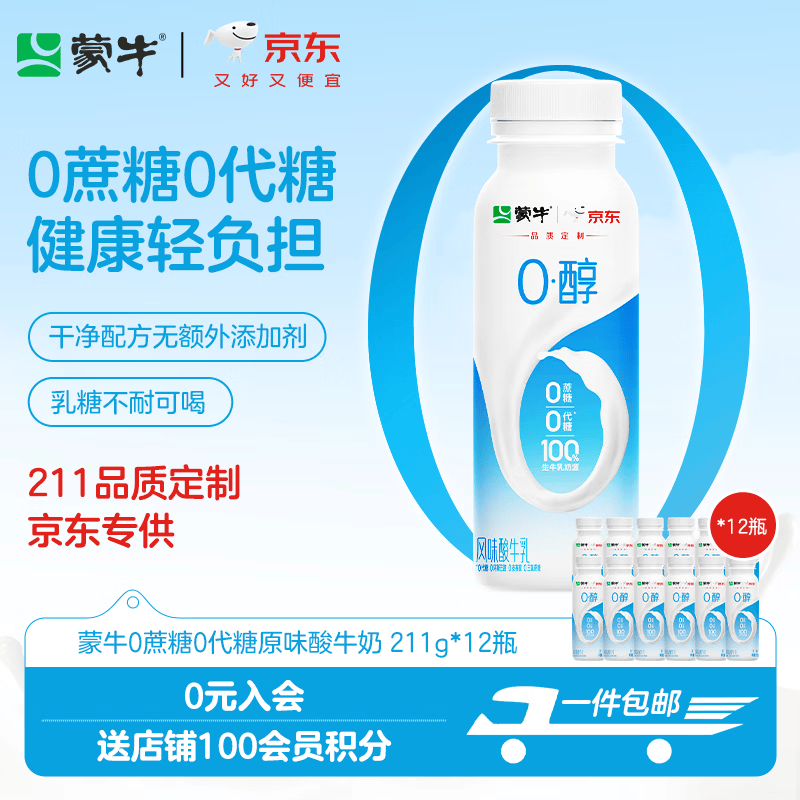 蒙牛(MENGNIU)0蔗糖0代糖原味酸牛奶京东专供211g×12瓶 乳糖不耐可喝
