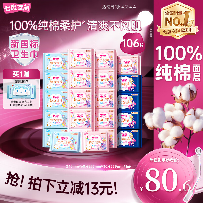 七度空间少女超薄透气100%纯棉亲肤106片日夜组合卫生巾【新国标认证】