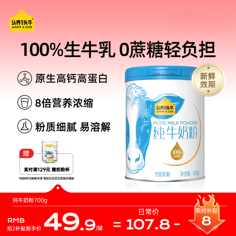 认养一头牛纯牛奶粉 100%生牛乳 高钙高蛋白 700g/罐 全家 老年人送礼冲饮