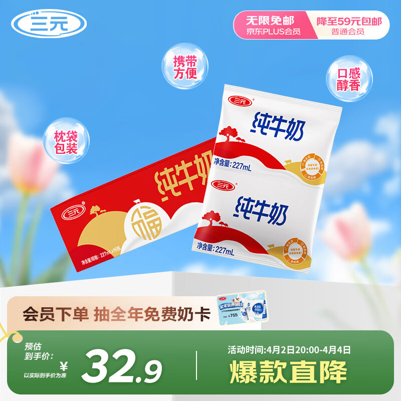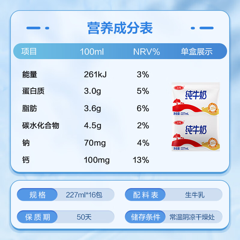 三元小福纯牛奶整箱227ml*16包 枕包 营养早餐伴侣 整箱送礼