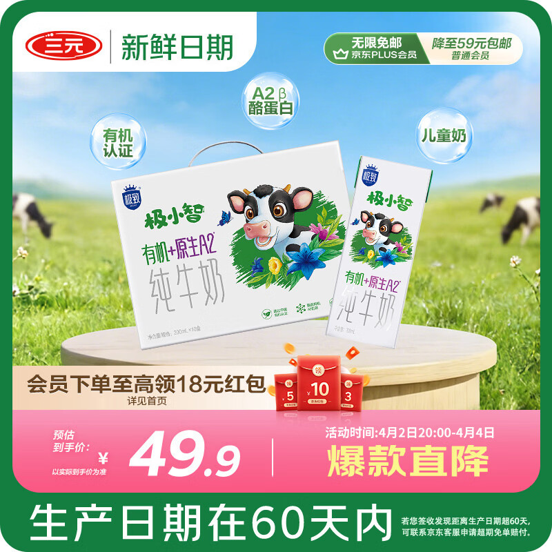 三元【新鲜日期】极致A2β-酪蛋白儿童有机纯牛奶200ml*10 整箱礼盒