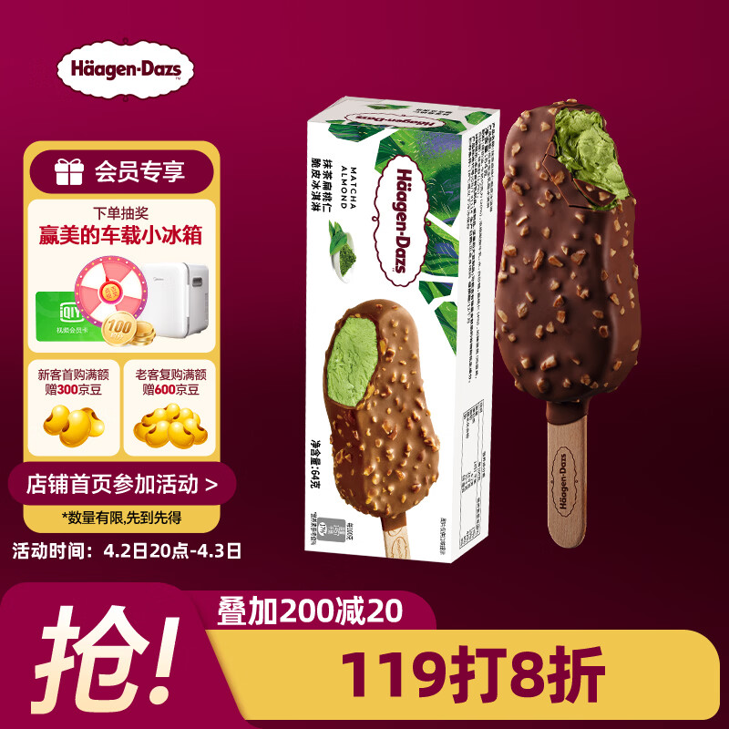哈根达斯(Haagen-Dazs)抹茶味扁桃仁脆皮条冰淇淋64g/支 雪糕