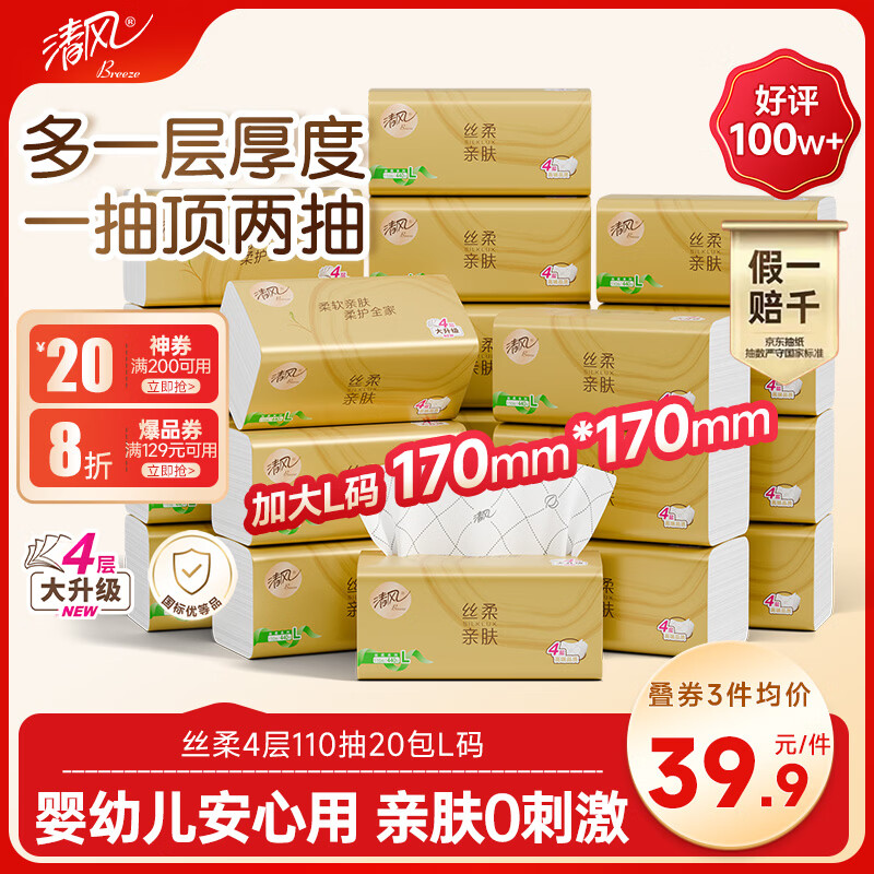 清风抽纸 丝柔4层110抽20包L码 纸巾卫生纸 餐巾纸纸抽 面巾纸 整箱装