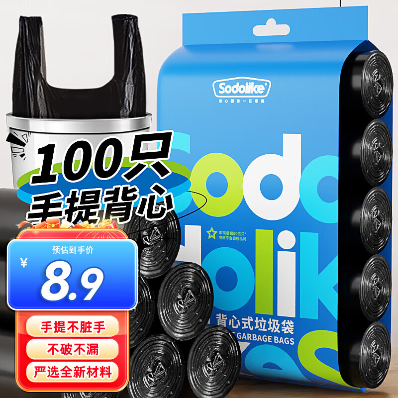 Sodolike尚岛背心垃圾袋黑色50*65cm100只单面0.85丝点断式手提