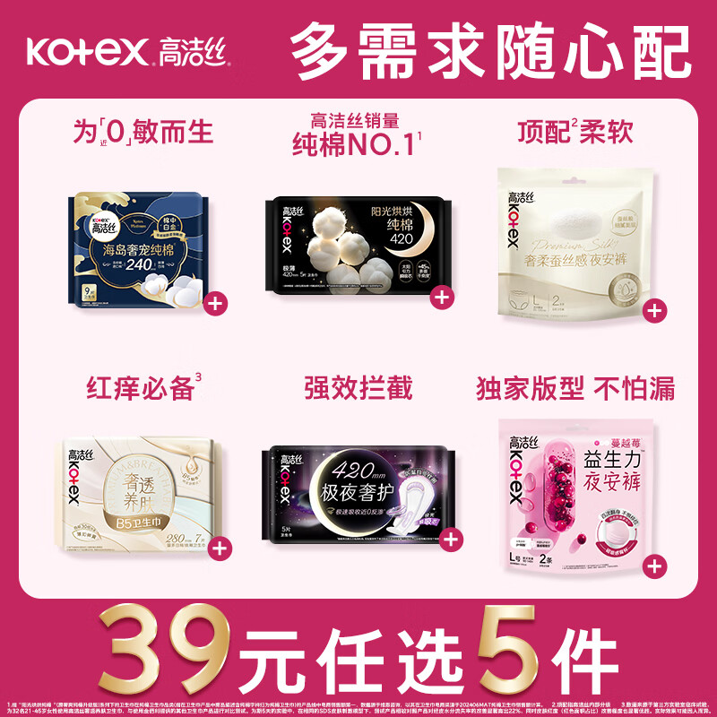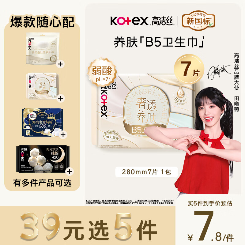 高洁丝【39元任选5件】红痒必备B5卫生巾280mm7片日用姨妈巾