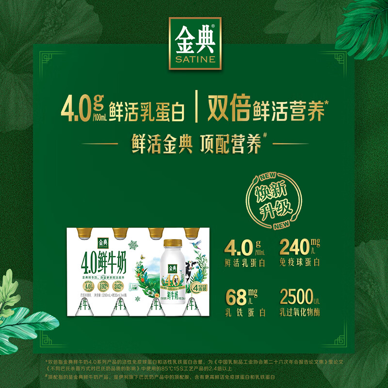 伊利金典鲜牛奶4.0g鲜活乳蛋白235ml*4瓶定制装巴氏杀菌低温鲜牛奶