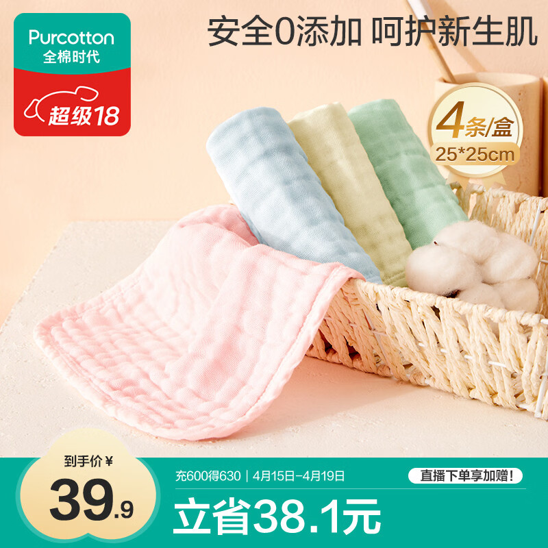 全棉时代(PurCotton) 全棉时代婴儿口水巾儿童水洗纱布小毛巾洗脸礼盒4条装 粉蓝黄绿25×25cm