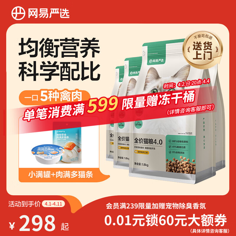网易严选全价猫粮4.0 宠物主粮成幼猫无谷鲜肉护肠胃 鸡鸭禽肉味1.8kg*4袋
