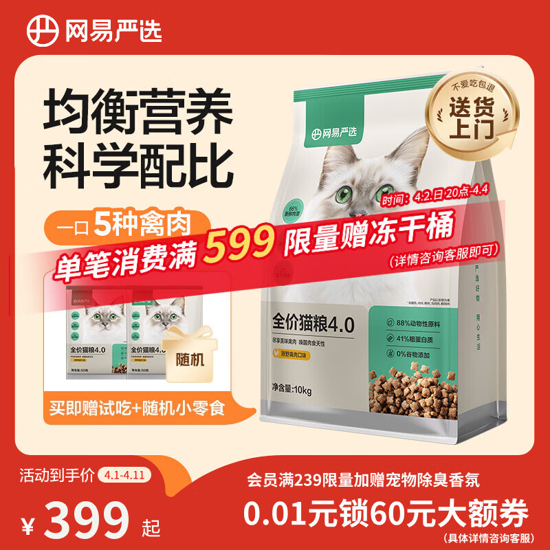 网易严选全价猫粮4.0 宠物主粮成幼猫无谷鲜肉美毛护肠胃 鸡鸭禽肉味10kg