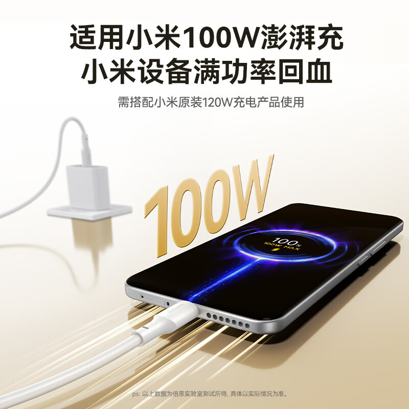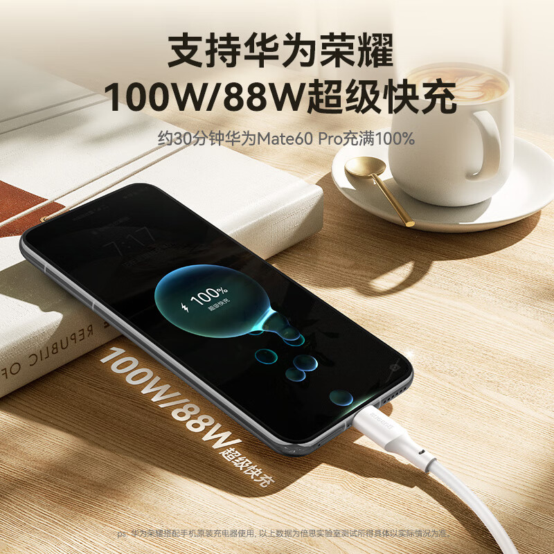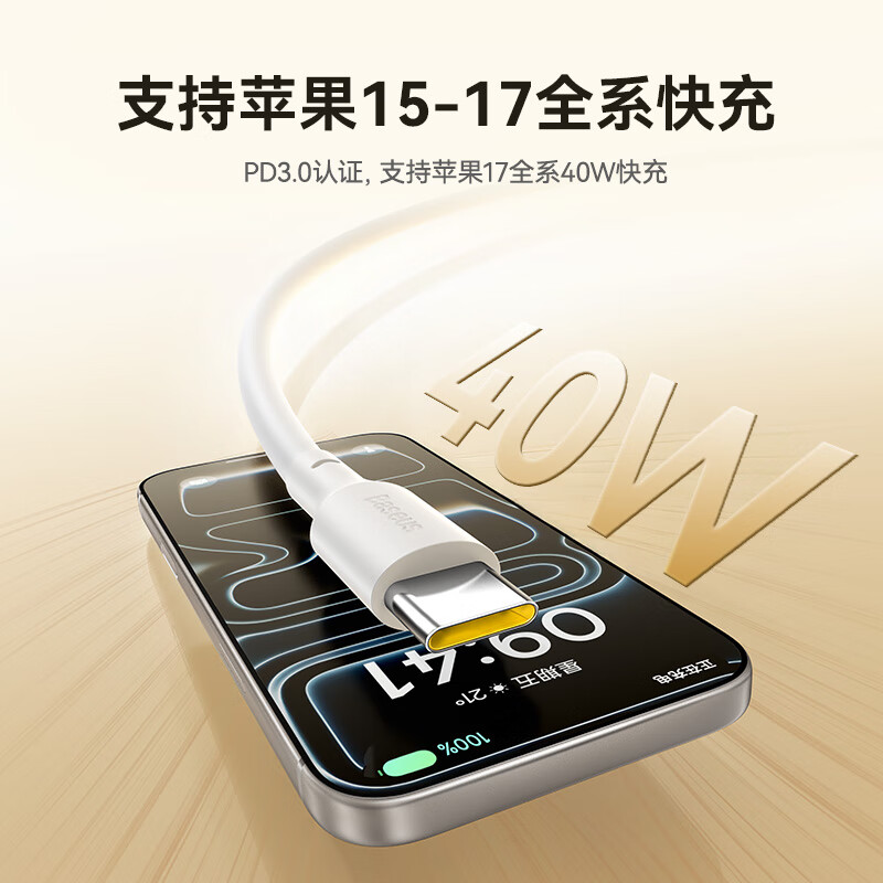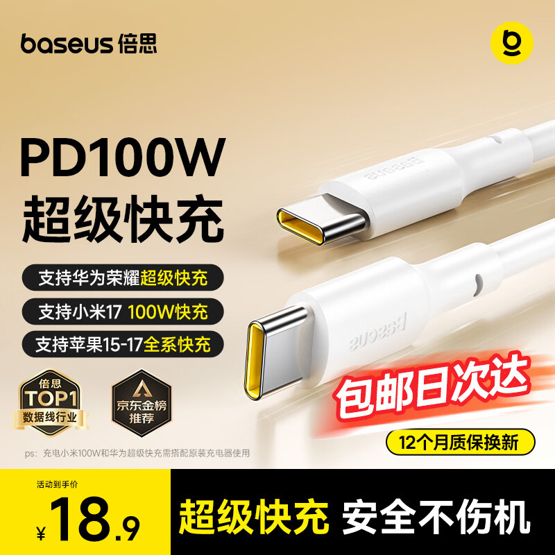 倍思双头Type-C充电线PD100W/88W超级快充数据线适用华为荣耀小米苹果17/16/15手机iPad笔记本车载 1米