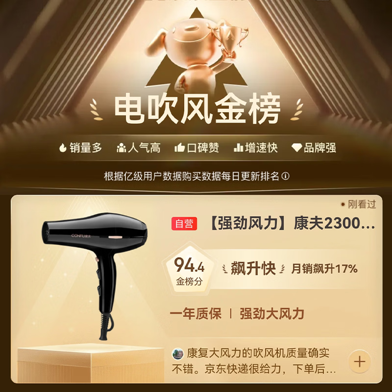 康夫(CONFU)电吹风机2300W大功率家用速干大风力护发吹头发理发店发廊专用生日礼物吹风筒KF-8926