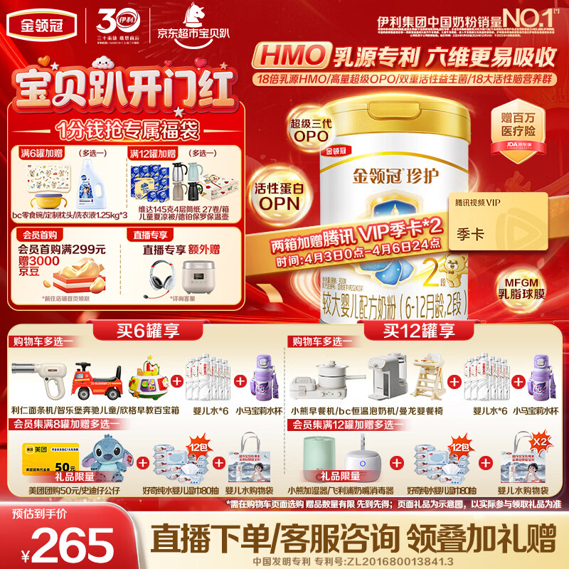 伊利金领冠珍护较大婴儿奶粉2段6-12月900g*1罐 三代OPO/HMO乳源专利