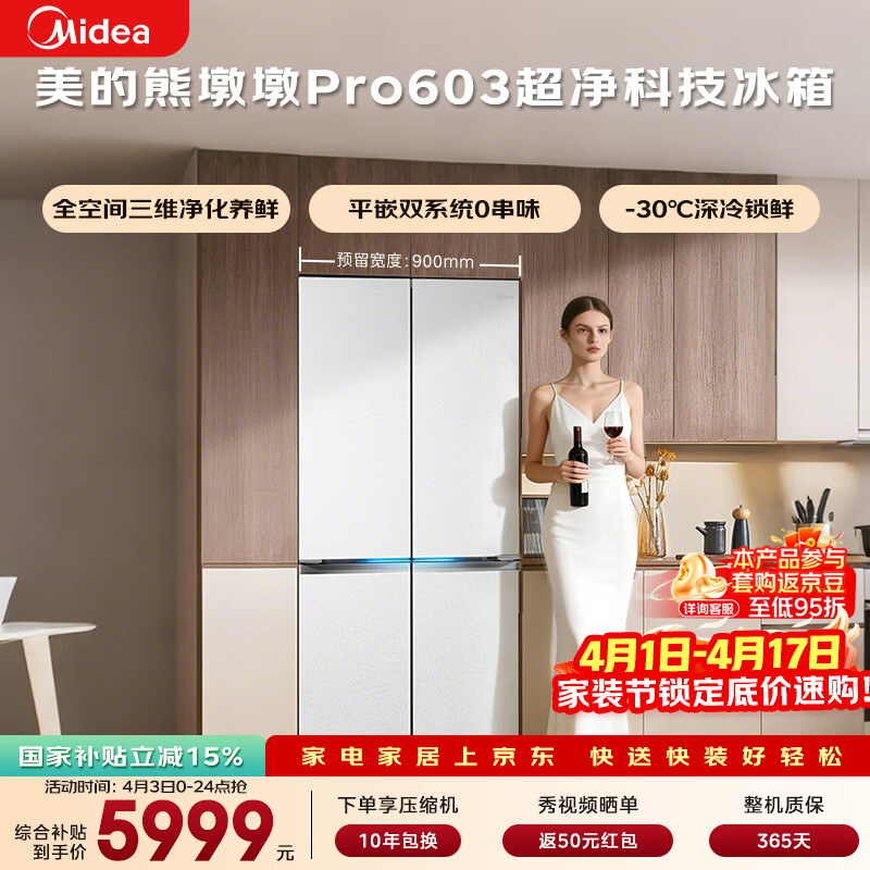 美的(Midea)熊墩墩603L十字门冰箱超薄零嵌入式双系统超大容量一级能效以旧换新白色BCD-603WUSPZM(E)国家补贴