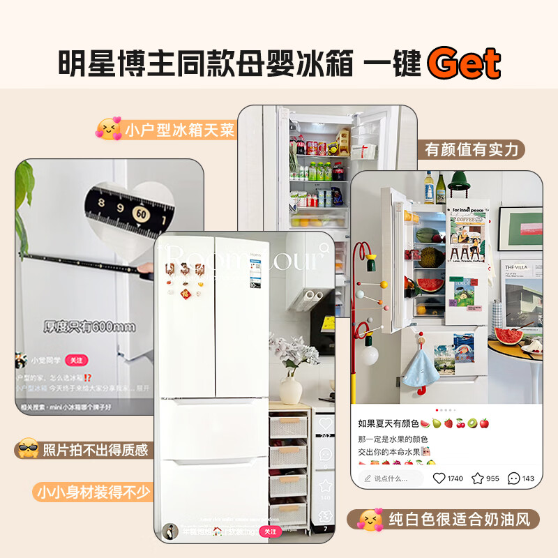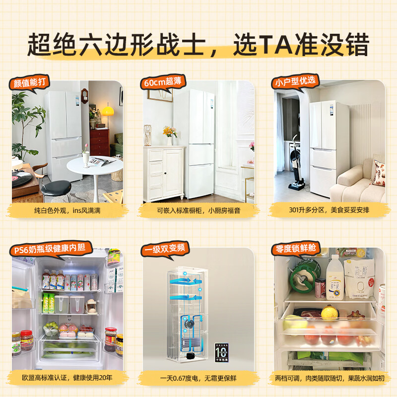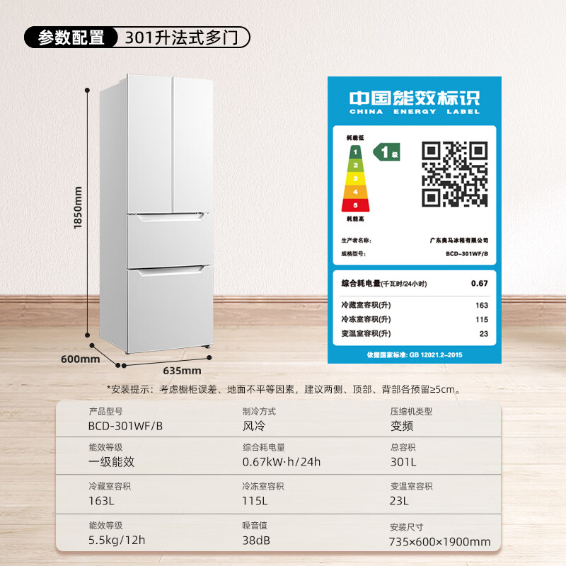 奥马(Homa)60cm超薄301升法式多门小型家用电冰箱一级能效变频风冷无霜四开门301WF/B国家补贴