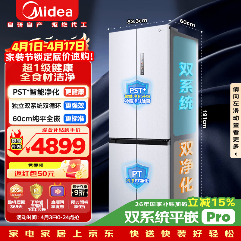 美的(Midea)M60小机皇515升十字门冰箱超薄嵌入式双系统大容量以旧换新MR-541WUSPZE国家补贴520姐妹