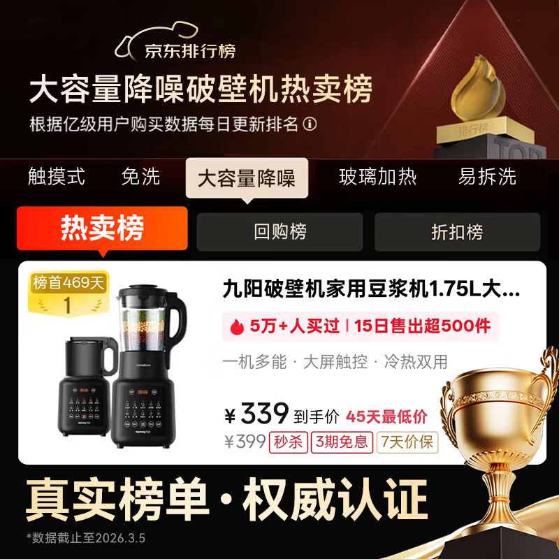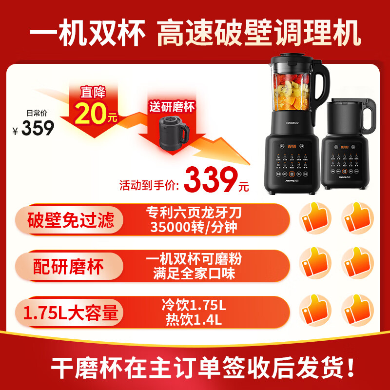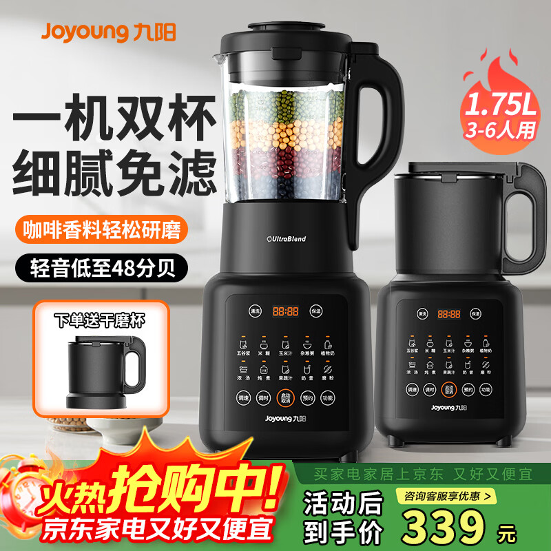 九阳破壁机家用豆浆机1.75L大容量3-4人多功能降噪轻音磨粉榨汁机全自动免煮2026自清洗免滤新款料理机 【高速破壁 低音降噪】镇店爆款-【豪华双杯】