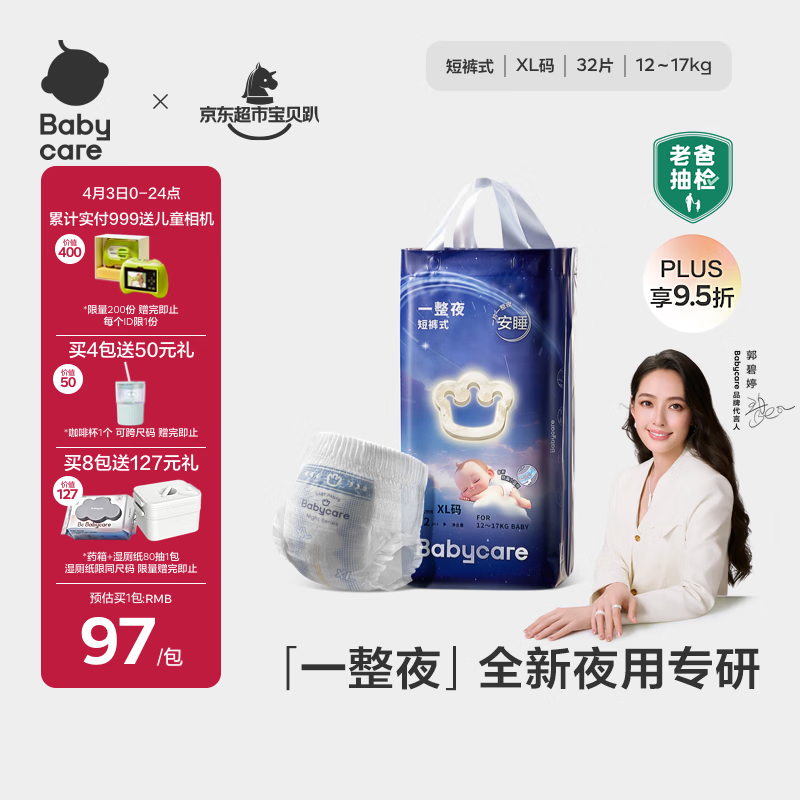 babycare一整夜拉拉裤XL32片(12-17kg)大吸量透气夜用安睡婴儿尿不湿