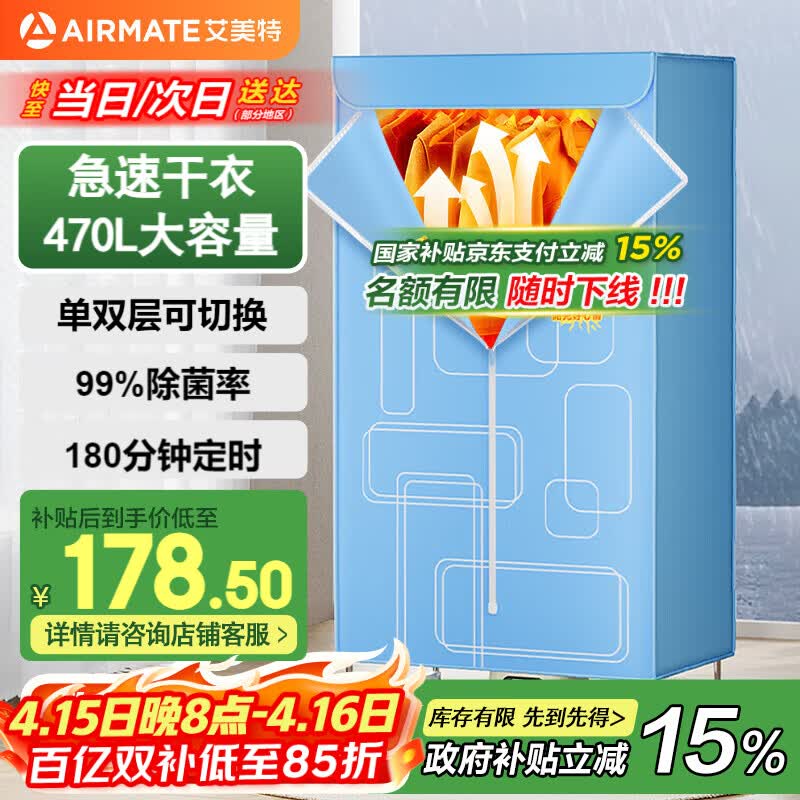 艾美特(AIRMATE)【470L大容量】烘干机家用干衣机烘衣机暖风机柔烘定时衣柜式婴儿内衣消毒机小型风干机 HGY905P