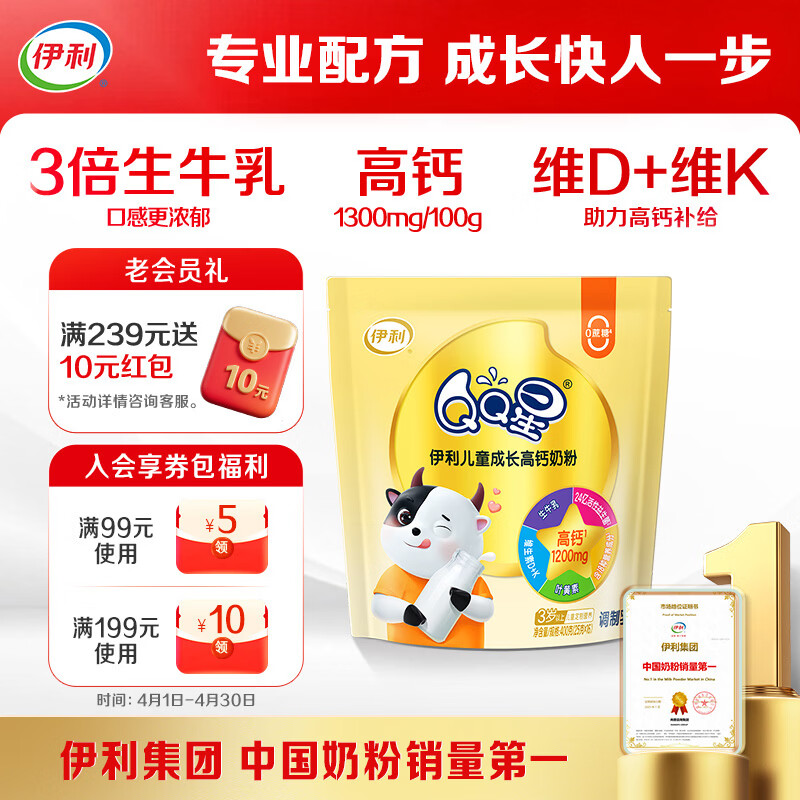 伊利QQ星儿童成长高钙奶粉 学生奶粉儿童奶粉生牛乳益生菌叶黄素 400g