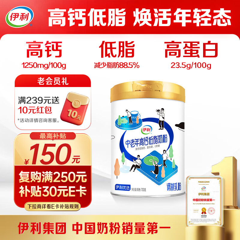 伊利中老年高钙低脂富硒0蔗糖奶粉 送礼送长辈 中老年奶粉 营养 700g