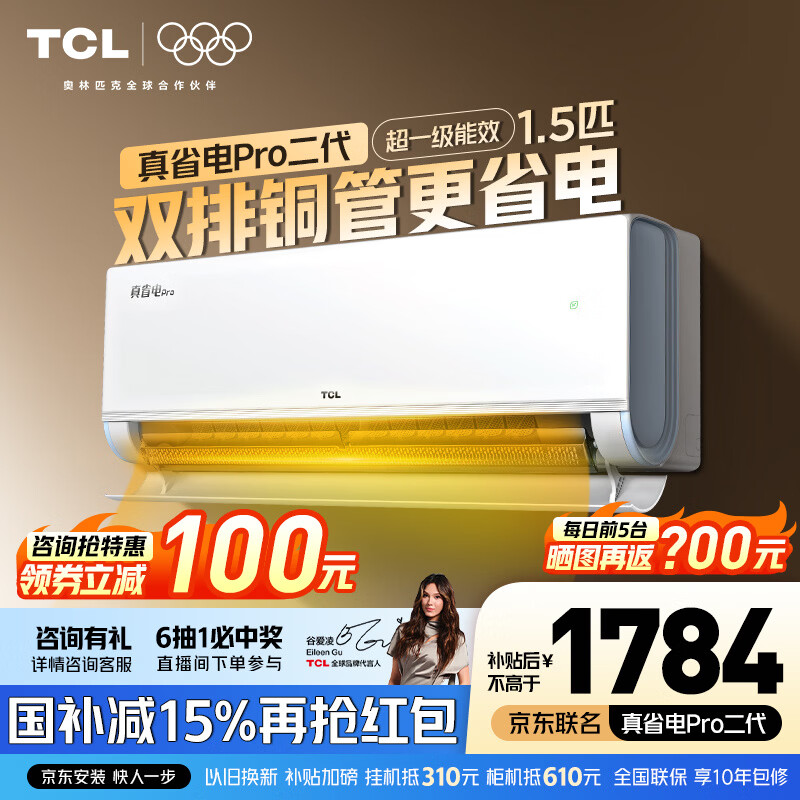 TCL空调 新品京东联名真省电Pro二代 1匹/大1.5匹/2匹新一级能效变频壁挂式卧室冷暖节能以旧换新补贴 真省电Pro二代 1.5匹 超一级能效 京东安装
