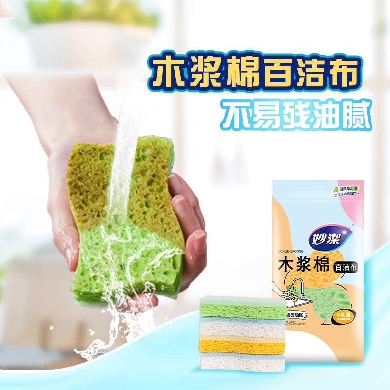 妙洁木浆棉百洁布6*10.5cm 4片装 海绵擦洗碗布百洁布厨房抹布家用